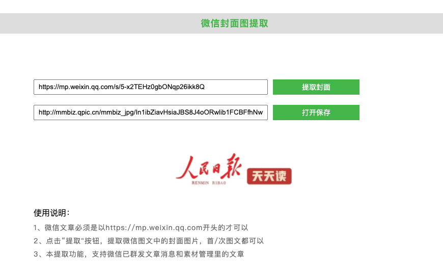打开网址:http://www.mgpaiban.com/tool/wxfm.html,输入微信公众号文章的链接,点击提取封面即可获取。